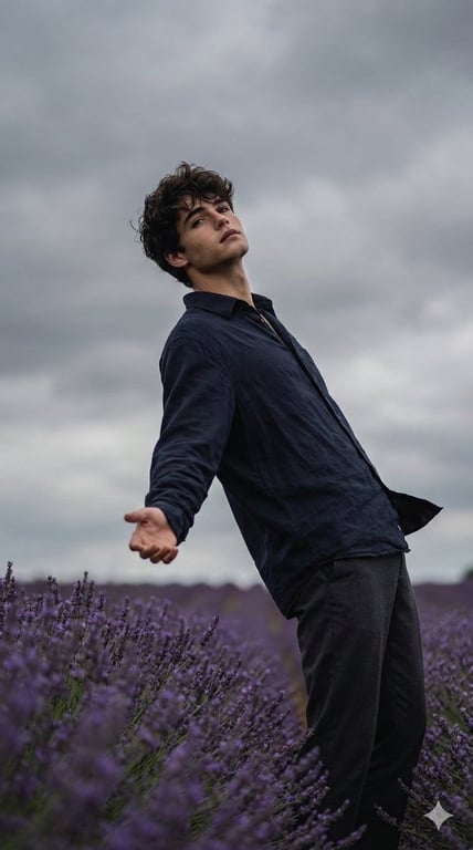 A prompt for generating a cinematic, moody photograph of a young man standing dramatically in a lush field under an overcast sky, wearing dark clothing. The focus is on expressive posture and natural facial proportions.