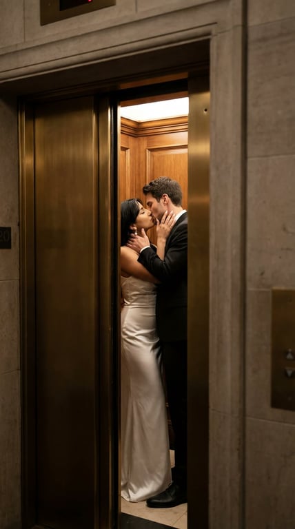 A highly specific JSON prompt for generating an ultra-photorealistic, cinematic film still of a couple kissing inside an elevator, framed by the partially closing gold doors. It mandates strict identity locking (requiring reference images), a voyeuristic candid framing, and warm tungsten lighting to evoke a luxury hotel atmosphere.