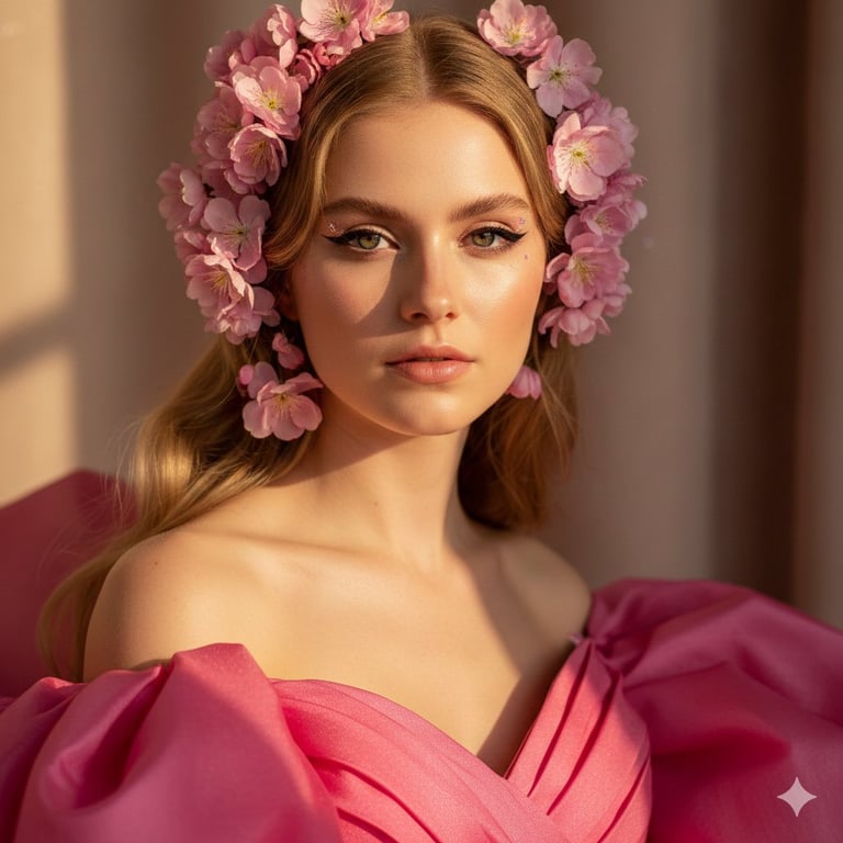 A structured prompt for an 8K HDR ultra-realistic, cinematic, high-fashion portrait of a young woman. It specifies detailed features, a vibrant pink off-the-shoulder dress, natural sunlight, and strict negative constraints to ensure photorealism and prevent common AI artifacts like plastic skin or melted fabric.