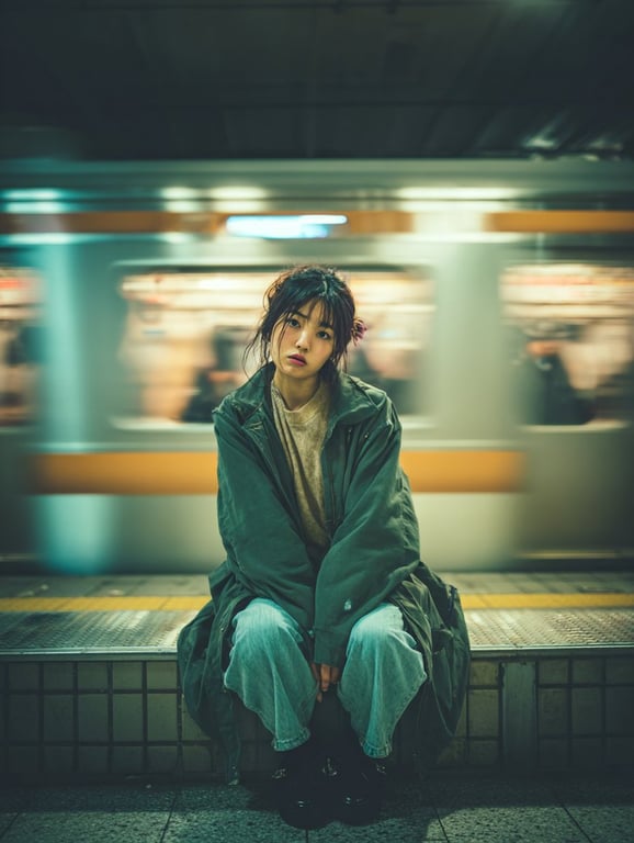 A detailed cinematic portrait prompt used across multiple AI models (Midjourney, Nano Banana Pro, GPT Image 1.5, Nano Banana 2) to generate an image of a young Japanese woman sitting alone on a bench at a Shinjuku train platform. The prompt emphasizes contrast between her stillness and the motion of the passing train.