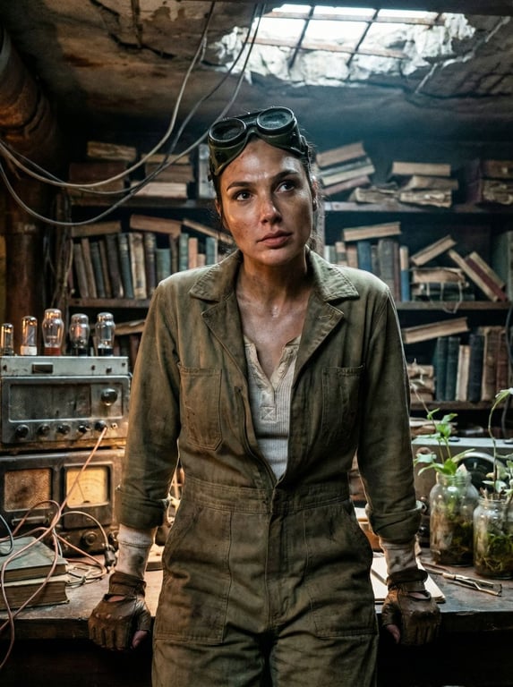 An extremely detailed JSON prompt for generating a cinematic, post-apocalyptic portrait (Gal Gadot style). The scene is a claustrophobic, cluttered underground bunker archive filled with decaying books and rusted equipment. It emphasizes low-key chiaroscuro lighting, heavy film grain (Kodak Vision3 500T), and authentic tactile textures to create a grounded, dirty reality.