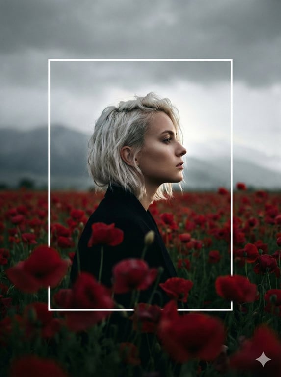 A prompt for generating a cinematic, high-contrast profile portrait of a woman with platinum-blonde hair standing in a field of deep crimson flowers under an overcast sky. The image features a modern artistic effect where a thin white rectangular frame is superimposed, and the subject breaks the frame edges.