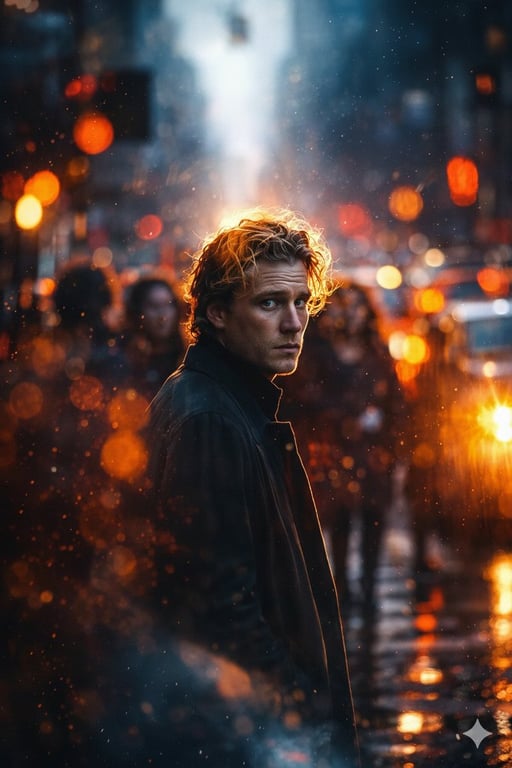 A high-definition, cinematic image generation prompt designed to create a moody, photorealistic portrait set on a rainy city street at night. The prompt emphasizes color grading contrast (warm golden bokeh against cool blue tones) and atmospheric details like rain droplets and dust particles to achieve a professional, ethereal look with shallow depth of field.