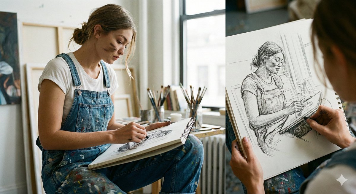 A complex, structured prompt designed to generate two contrasting scenes within a cinematic editorial realism style. Scene 1 is an indoor artist sketching by a window, focusing on introspection and natural light. Scene 2 is an outdoor golden hour moment with the subject absorbed in her phone, utilizing a frame-within-a-frame composition device.