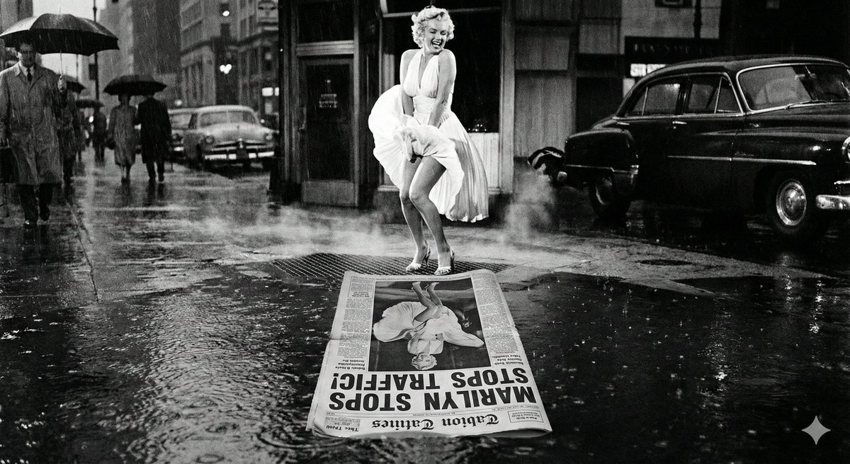 A complex, structured prompt designed to generate a photorealistic image featuring a subject near water. The key creative element is a physical, water-soaked paper floating on the surface, which displays a perfect, vertically inverted reflection of the scene above it, complete with a custom headline.