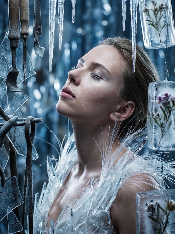 A highly complex and detailed JSON prompt for generating a cinematic surreal portrait titled 'Crystallized Melancholy'. It describes a protagonist in a cluttered 'Cryogenic Glass-Blower's Workshop', wearing a garment made of melting ice shards, with hyper-realistic focus on condensation and frost textures. It specifies moody, volumetric lighting (moonlight key light) and technical camera settings (Hasselblad H6D-100c, 80mm f/1.9 lens) for editorial surrealism.