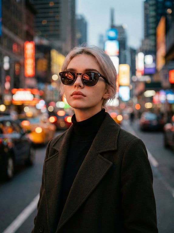 A prompt for generating a hyper-realistic, cinematic portrait of a woman standing on a bustling city street at twilight, focusing on dark fashion, dark sunglasses reflecting vibrant neon signs (bokeh effect), and soft, warm amber lighting for a moody urban vibe.