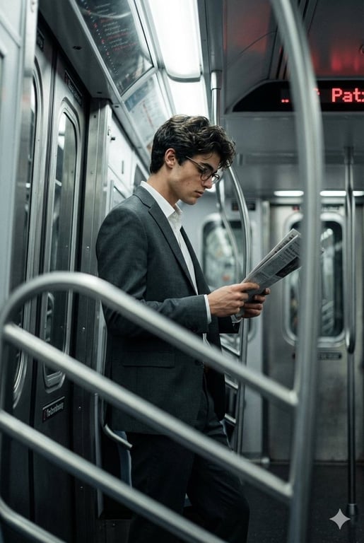 A highly detailed prompt for generating a cinematic fashion editorial portrait of a person (based on a reference image) inside a modern subway carriage. The prompt focuses on a moody, low-key lighting scheme, urban professional aesthetic, and a voyeuristic composition using foreground elements like handrails.