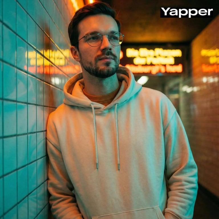 A structured JSON prompt for an ultra-realistic cinematic fashion portrait of a young man in modern urban streetwear. The scene is set in an urban tunnel at night, utilizing dramatic neon lighting (teal and orange color grading) and a low-angle shot with shallow depth of field to create a bold, high-fashion energy.