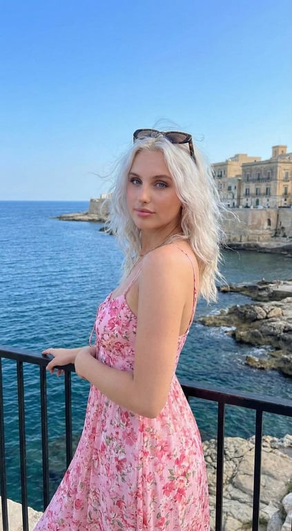 A detailed JSON prompt for Gemini Nano Banana, focusing on generating a photorealistic travel lifestyle portrait of a young woman at a coastal viewpoint. Crucially, it mandates 100% identity preservation based on an uploaded reference image, while changing the setting, pose, and outfit (a blue floral summer dress) to a Mediterranean summer mood.