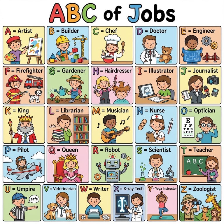 A simple prompt for generating a colorful educational poster for children, featuring the alphabet (A-Z) with cute illustrations representing different jobs, designed with a clean layout and bold letters.