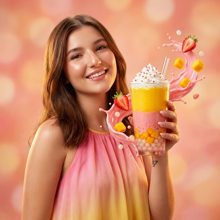 A photorealistic, ultra-detailed commercial advertising prompt for a layered mango-strawberry smoothie bubble tea, featuring a dramatic liquid splash, suspended ingredients, and a beautiful young woman in a matching summer dress, designed for a luxury brand campaign.