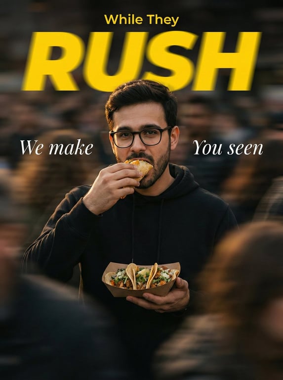 A prompt for generating a commercial photograph featuring a perfectly still subject (man eating a taco) against a heavily motion-blurred, chaotic background of a crowd. The prompt specifies cinematic lighting, high contrast, and the inclusion of overlay text to convey a dynamic, focused moment.