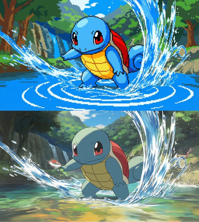 A brief prompt instructing the model to recreate an entire scene, including water splashes and background, as low resolution pixel art.
