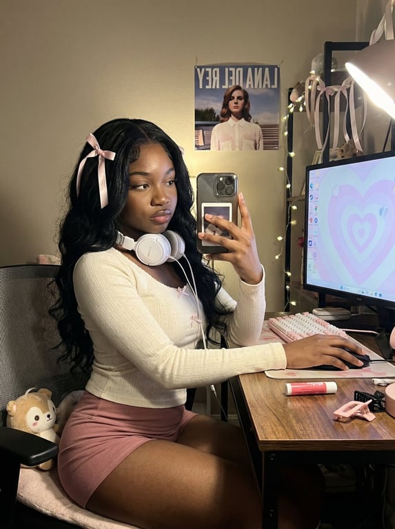 A detailed JSON prompt for generating a photorealistic image of a dark-skinned Black woman taking a selfie at a small gaming desk. The prompt specifies a 'coquette gamer girl' aesthetic, focusing on soft pastel colors, warm lighting, and realistic details like natural skin texture, specific background elements (Lana Del Rey poster, fairy lights), and a playful pose.