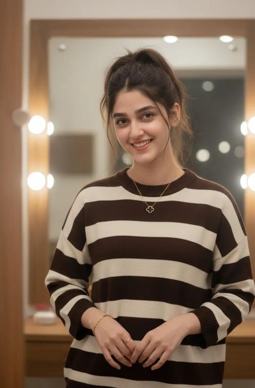 A detailed JSON prompt for generating a warm, intimate indoor lifestyle portrait of a young woman. The scene is set in a dressing room with a vanity mirror, emphasizing soft lighting, a cozy wardrobe (striped oversized sweater), and a candid, relaxed mood, aiming for high realism with minimal retouching.