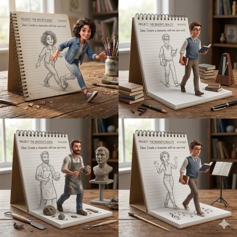 A prompt for generating an ultra-realistic creative concept image where hand-drawn pencil characters transition into detailed 3D Pixar-style animated characters as they step out of a sketchbook on a wooden desk, surrounded by tools of various creative professions.