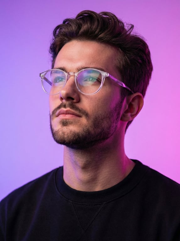 A prompt for Nano Banana Pro to generate an ultra-realistic, cyber-modern portrait of a man wearing transparent glasses and a black sweatshirt, featuring neon purple and pink gradient background lighting.