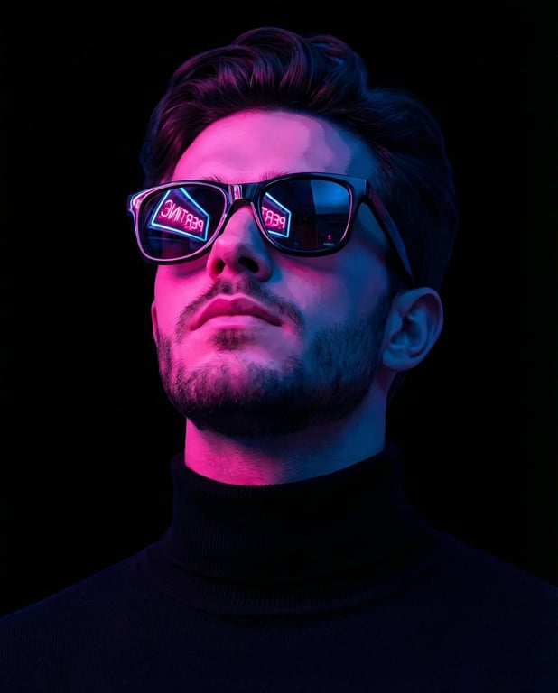 A prompt for creating a bold, stylized, half-length cyber-noir portrait from an input photo, featuring a low-angle view, neon reflections on large glossy sunglasses, and a pure black background with sharp posterized gradients.