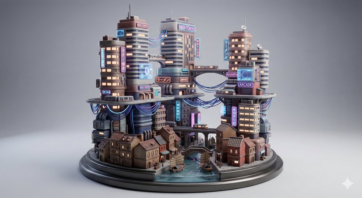 A detailed prompt for generating a stylized 3D miniature diorama of a layered cyberpunk city block, combining historic ground structures with neon skyscrapers. The style is specified as a premium collectible, sculpted from smooth ceramic or resin with clean, toy-like proportions and soft studio product lighting.