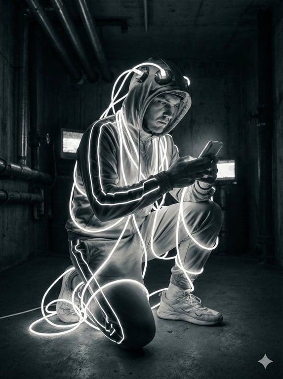 A prompt comparing Nano Banana Pro and Grok Imagine, requesting a monochromatic digital human kneeling in a dark space. The subject is wrapped in glowing white cables connected to the head, limbs, and chest, wearing a futuristic tracksuit with neon stripes, and holding a smartphone. The style is editorial, cyberpunk, with stark contrast and themes of digital dependence.