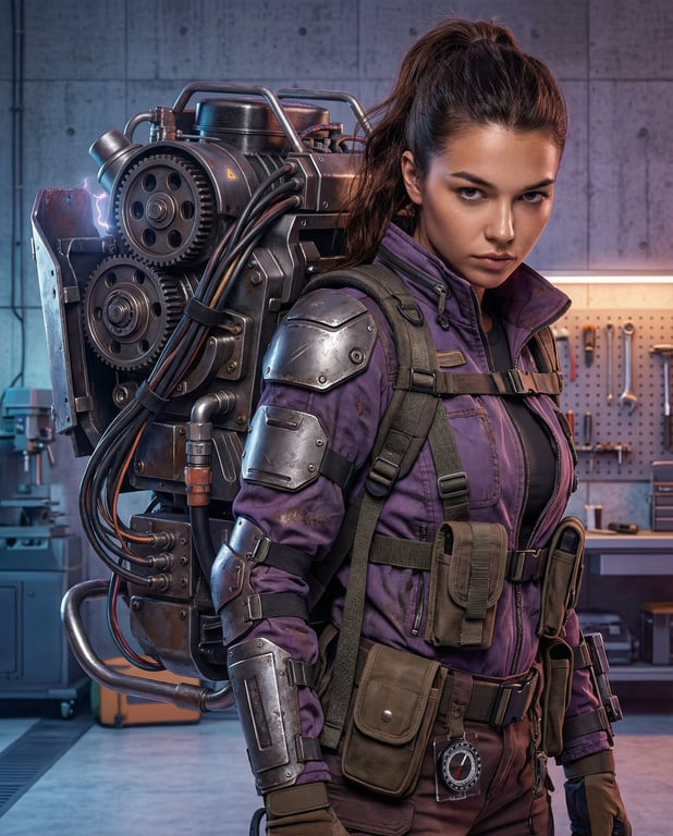 A highly structured prompt for generating an ultra-realistic, cinematic, cyberpunk portrait of a female mechanic wearing a massive, detailed mechanical exosuit backpack in a minimal industrial workshop setting, emphasizing hyper-detailed textures and dramatic lighting.