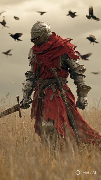 A detailed image generation prompt for Nano Banana 2, focusing on creating a hyper-realistic, 8k dark fantasy wallpaper featuring a battle-worn knight in detailed steel armor walking through a golden grass field. The prompt specifies cinematic camera settings, lighting, and atmosphere.