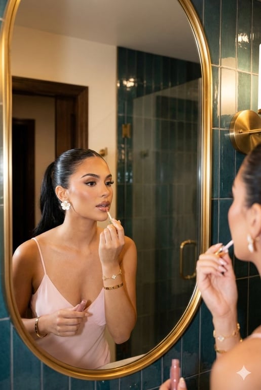 A highly structured prompt configuration for the Gemini 3.0 Nano Banana Pro model, detailing the subject, environment, lighting, and technical metadata to generate a photorealistic image of a glamorous woman applying lip gloss in a luxury bathroom mirror.