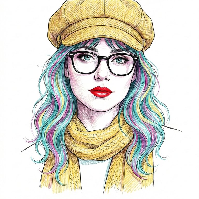 A prompt for generating a highly detailed digital line art portrait illustration, based on a reference image for facial proportions, featuring specific accessories (yellow newsboy hat, scarf, black-rimmed glasses), turquoise hair, and a colored pencil texture effect.