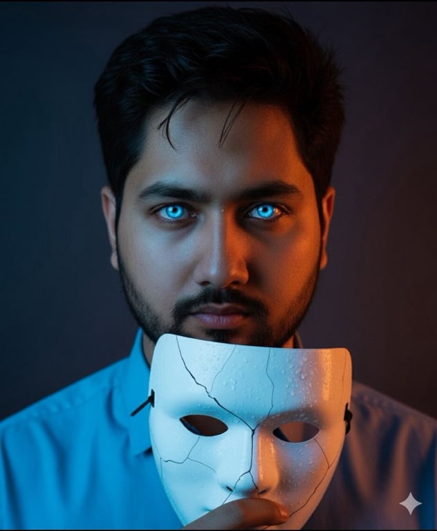 A prompt for generating an intense, close-up portrait of a young man with wet, glistening skin, holding a cracked white mask, highlighted by dramatic, contrasting blue and orange cinematic lighting to create a mysterious atmosphere.