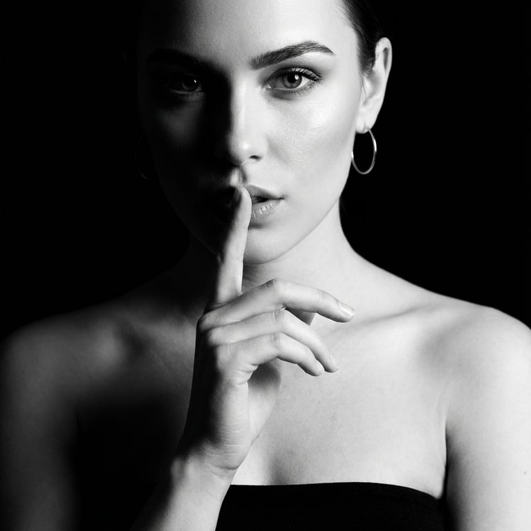 A highly detailed image generation prompt for Google Gemini Nano Banana Pro 3.0, describing a dramatic, high-contrast monochromatic portrait of a young woman with a sophisticated and alluring presence, emphasizing deep shadows, high-fashion editorial style, and specific lighting techniques.