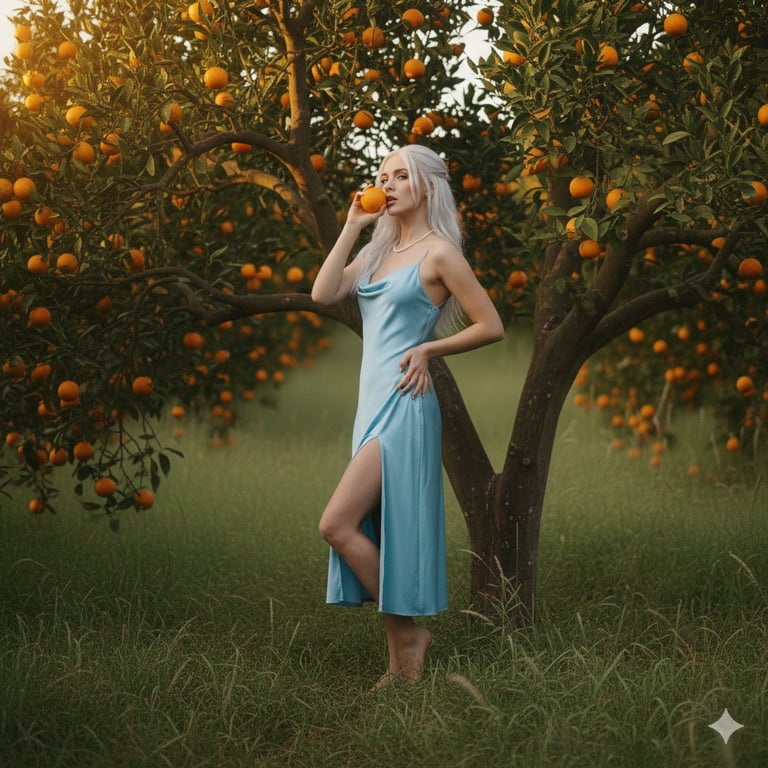 A prompt for generating a dreamy, editorial portrait of a young woman with platinum hair in a light blue slip dress, posing barefoot in a sun-drenched orange grove at golden hour, emphasizing shallow depth of field and warm, nostalgic tones.