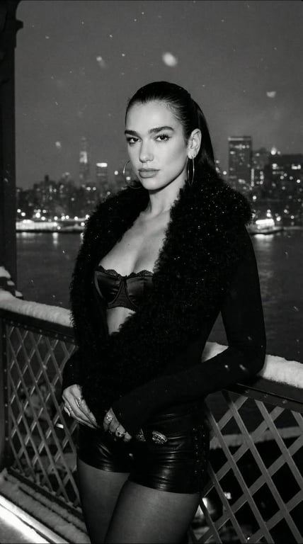 A highly structured image generation prompt for a cinematic, black and white fashion editorial portrait of Dua Lipa in a snowy New York City setting, focusing on detailed facial geometry, specific wardrobe (fuzzy knit outerwear, lace-trim bra top, leather micro shorts), and technical specifications for a high-end magazine cover aesthetic.