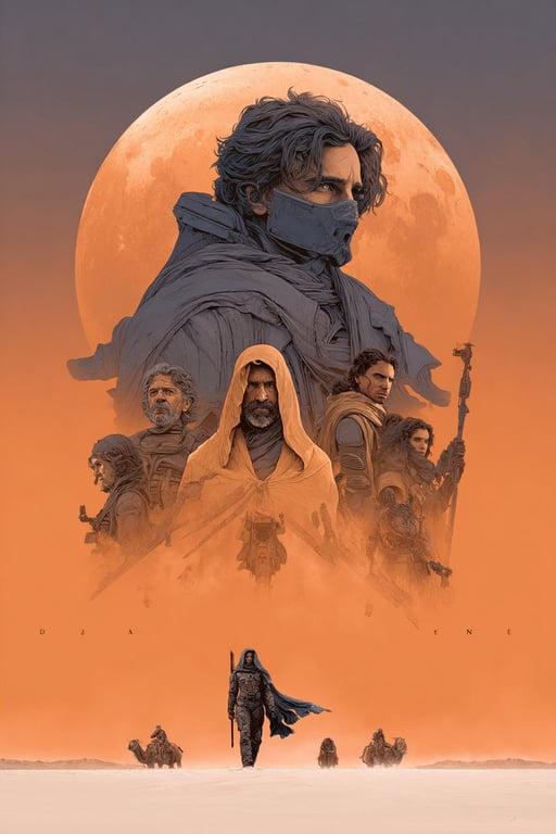 A prompt used to generate a movie poster for Dune 2 featuring all main characters, set against a desert background, and rendered in the distinct style of Moebius. This prompt was tested across multiple AI models, including Nano Banana 2.