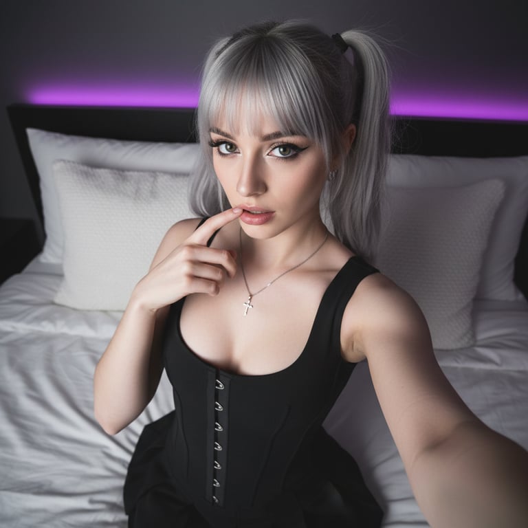 A structured prompt for generating an E-girl style, high-angle selfie of a young woman with silver-grey hair and heavy makeup. The image is set in a dimly lit bedroom with purple LED accent lighting, utilizing direct on-camera flash for a harsh, high-contrast Y2K digital aesthetic.