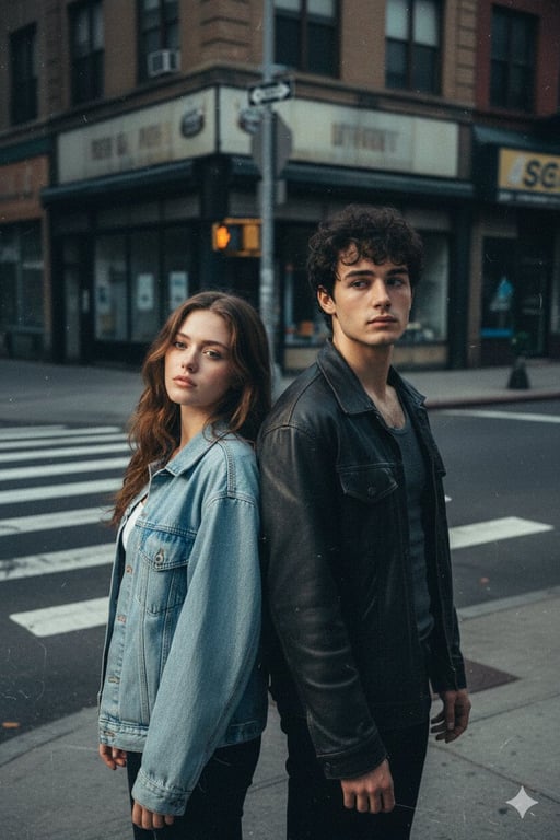 A prompt for Nano Banana Pro designed to merge the identities of two uploaded photos into a single image, generating a raw, flash-lit, vintage digicam aesthetic photo of a man and woman standing back-to-back on a sidewalk, strictly preserving the original facial features while applying the early 2000s snapshot style.
