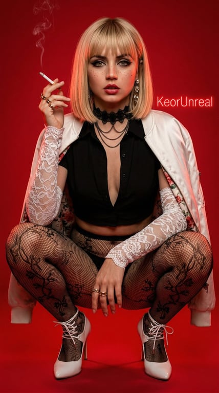 A highly detailed, ultra-realistic prompt for Nano Banana 2 or Nano Banana Pro, designed to generate a dramatic fashion portrait of a specified celebrity (Ana de Armas, Anya Taylor-Joy, Millie Bobby Brown, or Sabrina Carpenter) with an edgy style, intense gaze, and dramatic rim lighting against a vibrant red background.