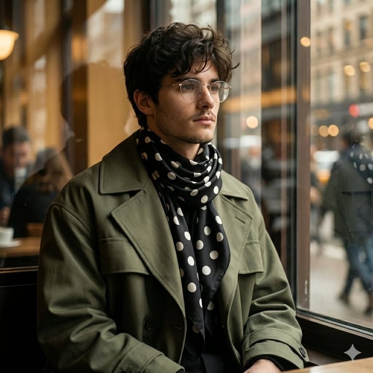 A detailed prompt for generating an editorial fashion portrait of a young man wearing a voluminous silk scarf and oversized trench coat, set in a city café viewed through a reflective window, emphasizing texture contrast, low-key cinematic lighting, and a modern, high-fashion aesthetic.