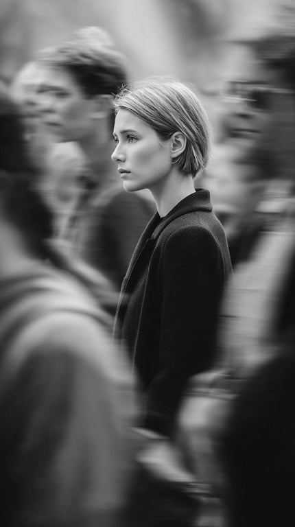 A highly technical prompt for Gemini Nano Banana Pro, specifying the generation of an editorial monochrome street photograph. It details the camera equipment (Leica SL3, 75mm APO-Summicron at f/2.8), settings (slow shutter, shallow compression), lighting (overcast daylight), and subject details (woman in clean side profile, minimal tailoring).