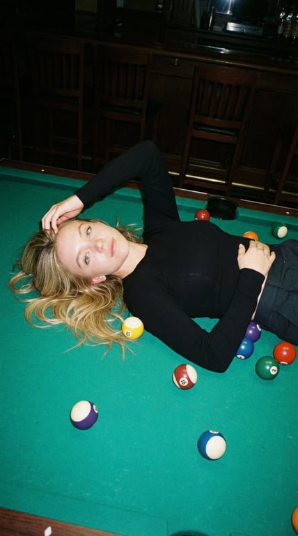A highly structured JSON prompt for Nano Banana Pro to generate an image of a young woman (Sydney Sweeney) lying sideways on a green felt billiards table in a dimly lit bar. The prompt mandates strict identity lock, specifies flash photography lighting for harsh shadows and highlights, and details the pose, clothing, and environment for an editorial nightlife candid aesthetic.