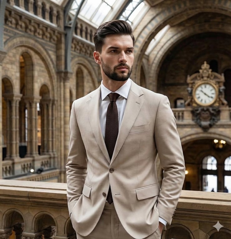 A detailed, structured prompt designed for generating a sophisticated editorial portrait photograph of a young man, emphasizing composition, color profile, and lighting within a grand architectural setting. The prompt specifies technical details like aspect ratio, depth of field, and texture for a realistic, high-quality output.