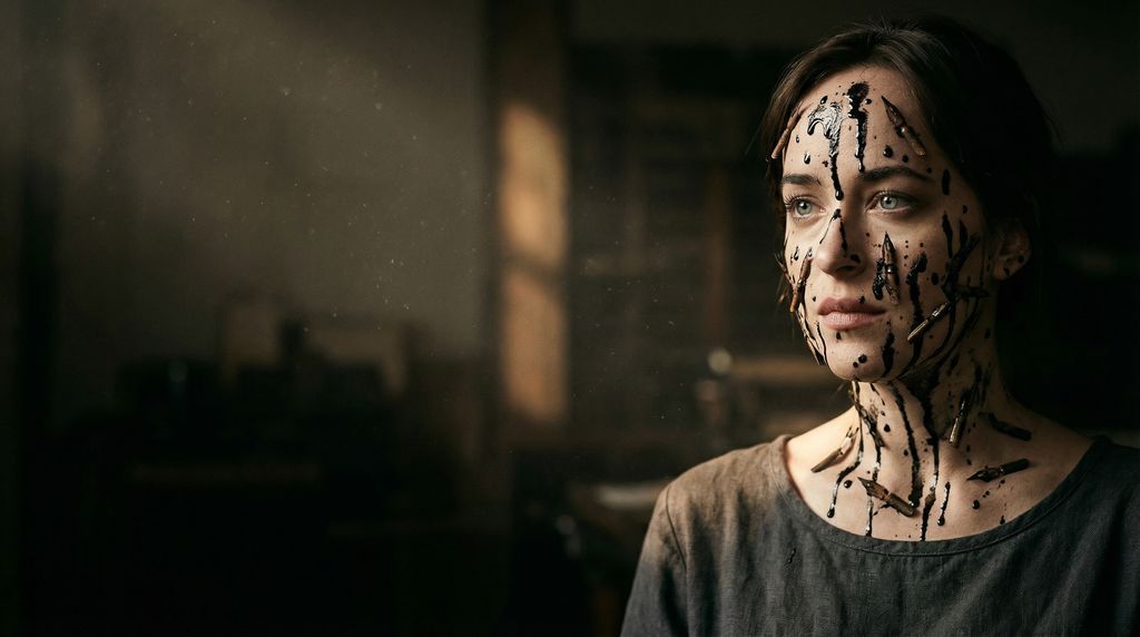 A highly detailed, structured prompt for generating a hyper-realistic, surreal editorial portrait. The prompt specifies cinematic composition (Rule of Thirds), high-contrast Chiaroscuro lighting, and a surreal visual translation where the subject's face is covered in viscous black India ink and antique calligraphy nibs, simulating a practical effect. It targets a specific device profile (Hasselblad H6D-100c) and film simulation (Kodak Portra 800) for maximum realism and mood.