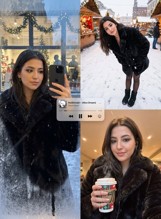 A complex, multi-panel image generation prompt for an editorial winter poster collage. It requires zero deviation from the reference face and generates three spontaneous, cozy, and realistic iPhone-style shots featuring a woman in winter attire (fur coat, UGG boots) with black hair and smokey eyes, incorporating elements like soft snowfall and reflections.