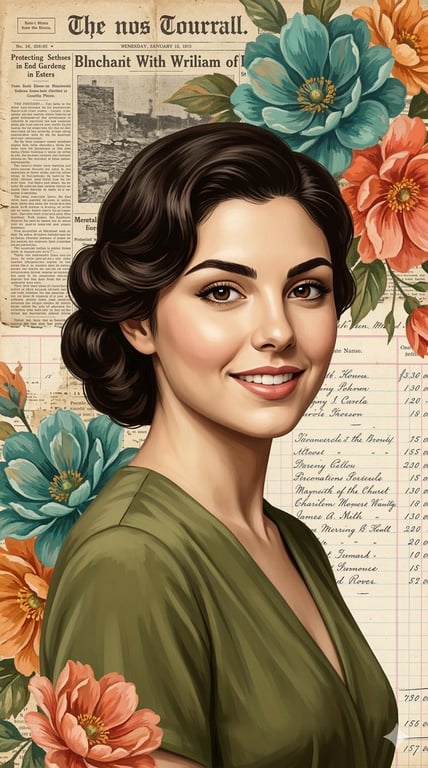A detailed prompt for Gemini Nano Banana Pro 2.0 to create an elegant digital illustration of a woman based on a reference photo, blending vintage realism with collage elements and large painterly floral blooms.
