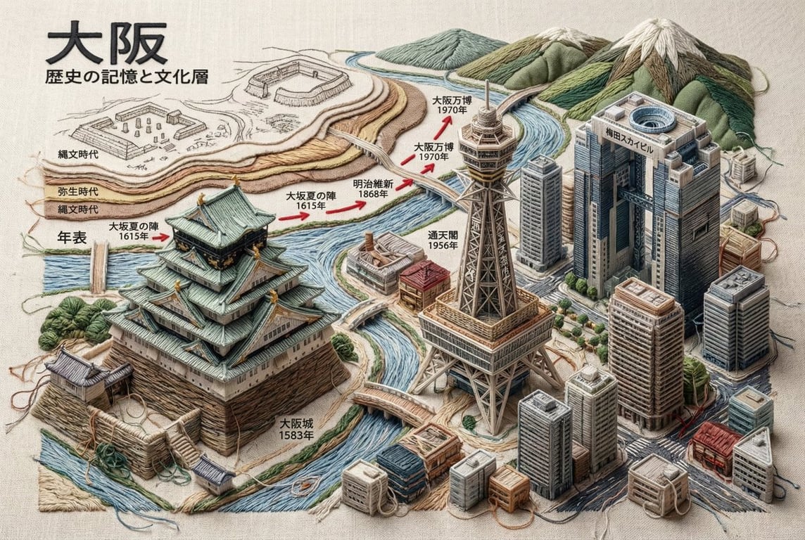 An extremely detailed, highly constrained image generation prompt for Nano Banana Pro to create a hyper-realistic 3D isometric cityscape entirely constructed from textile art, specifically embroidery and weaving. The prompt strictly prohibits non-textile materials (stone, metal, wood) and enforces rules for visible thread ends, hand-made authenticity, and Japanese text labels for historical and geographical elements. The user must input the name of the city to be depicted.