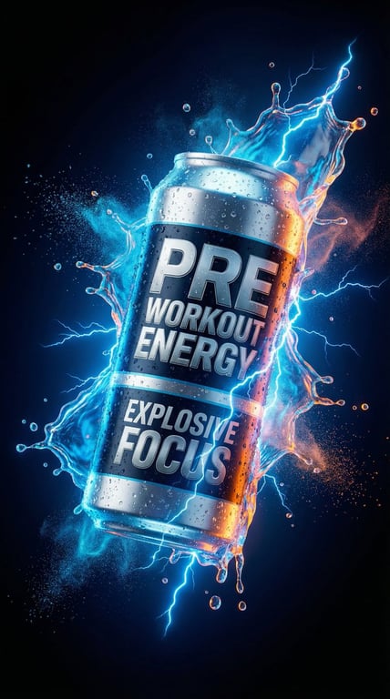 A structured JSON template designed for generating hyper-realistic, 8K commercial advertisements for an energy drink. It focuses on frozen motion effects like liquid splashes, neon sparks, and particle dust, set against a dark, high-contrast background to convey intense gym energy and powerful focus.
