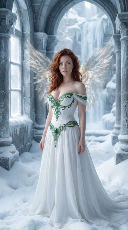 A highly detailed JSON prompt for Nano Banana Pro to generate a cinematic fantasy art image. It describes an ethereal woman with copper-red hair and translucent white wings, standing in a frozen gothic archway. The prompt specifies intricate details of her ivory and emerald gown, the icy background elements, and the soft, diffused lighting to create a cold, serene winter wonderland mood.