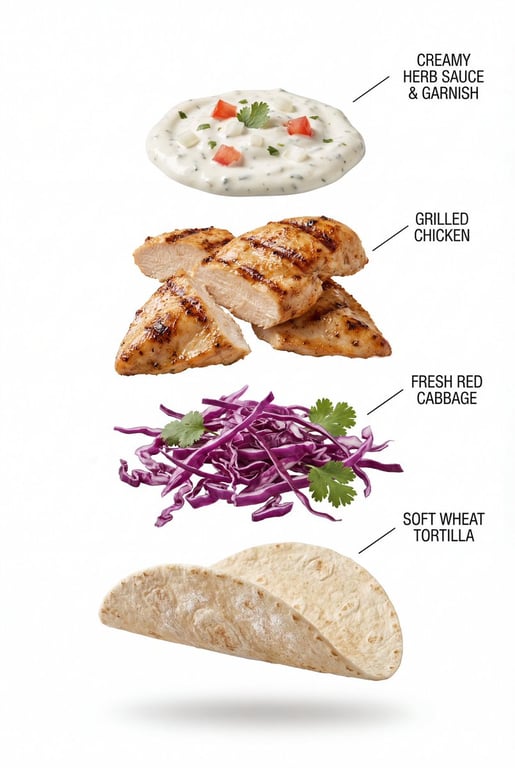 A complex prompt for generating two high-quality images of a grilled chicken taco: a professional product photograph and a hyper-realistic exploded vertical infographic composition, emphasizing texture, alignment, and commercial food photography aesthetics. It also includes a motion prompt for a video generation model (Kling 3.0) describing the taco's slow, controlled rotation and separation.
