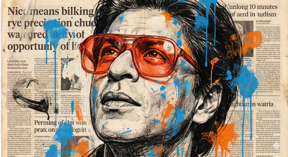 A prompt for generating a vibrant, expressive portrait that blends realism and abstract expressionism. The subject, based on a reference image, is sketched in black strokes on a textured newspaper background, enhanced with vivid paint splashes, focusing on a sense of wonder and creativity.