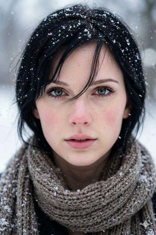 A highly structured prompt for an extreme close-up, cinematic portrait of a young woman in a winter setting. The focus is razor-sharp on the eyes and eyelashes, capturing hyper-realistic skin texture, falling snow, and a chilly, ethereal mood using cool tones and soft, diffuse lighting.
